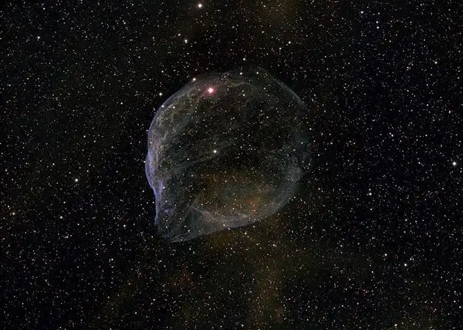 Выдутый быстрым ветром с горячей, массивной звезды, этот космический пузырь огромен. Он называется Шарплесс 2-308 и находится от нас на расстоянии 5200 световых лет в созвездии Большого Пса. Возраст звездного пузыря — 70 000 лет.