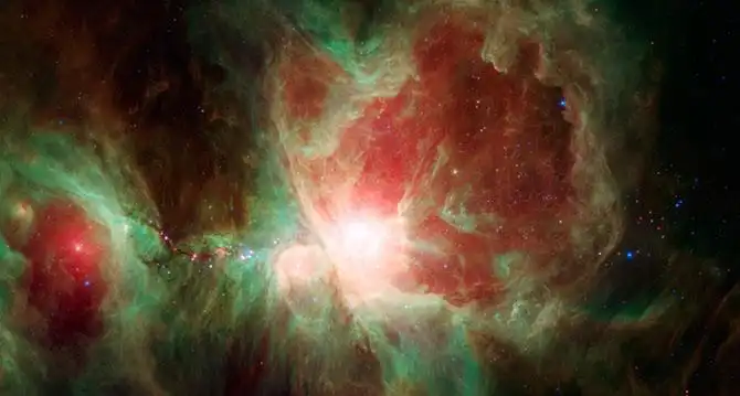 Немногие космические пейзажи так будоражат воображение, как туманность Ориона, расположенная на расстоянии 1 500 световых лет от нас. Эта удивительная фотография в искусственных цветах, созданная по инфракрасным данным с космического телескопа.