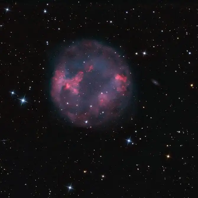 Планетарная туманность — это непродолжительная финальная стадия звездной эволюции, во время которой центральная звезда, похожая на Солнце, сбрасывает свои внешние слои. Для нашего Солнца такая стадия наступит через 5 млрд лет. Туманность Abell 7 совсем молодая, ей около 20 000 лет. Ее центральная звезда, возраст которой около 10 млрд лет, уже превратилась в слабеющий белый карлик.