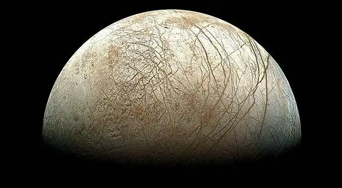 Это Европа — спутник гиганта-Юпитера. На снимке, полученным автоматическим космическим аппаратом Галилео, видны равнины из светлого льда. Размерами Европа похожа на Луну, но ее поверхность гораздо ровнее.