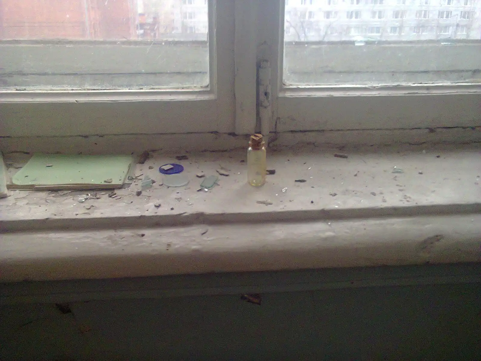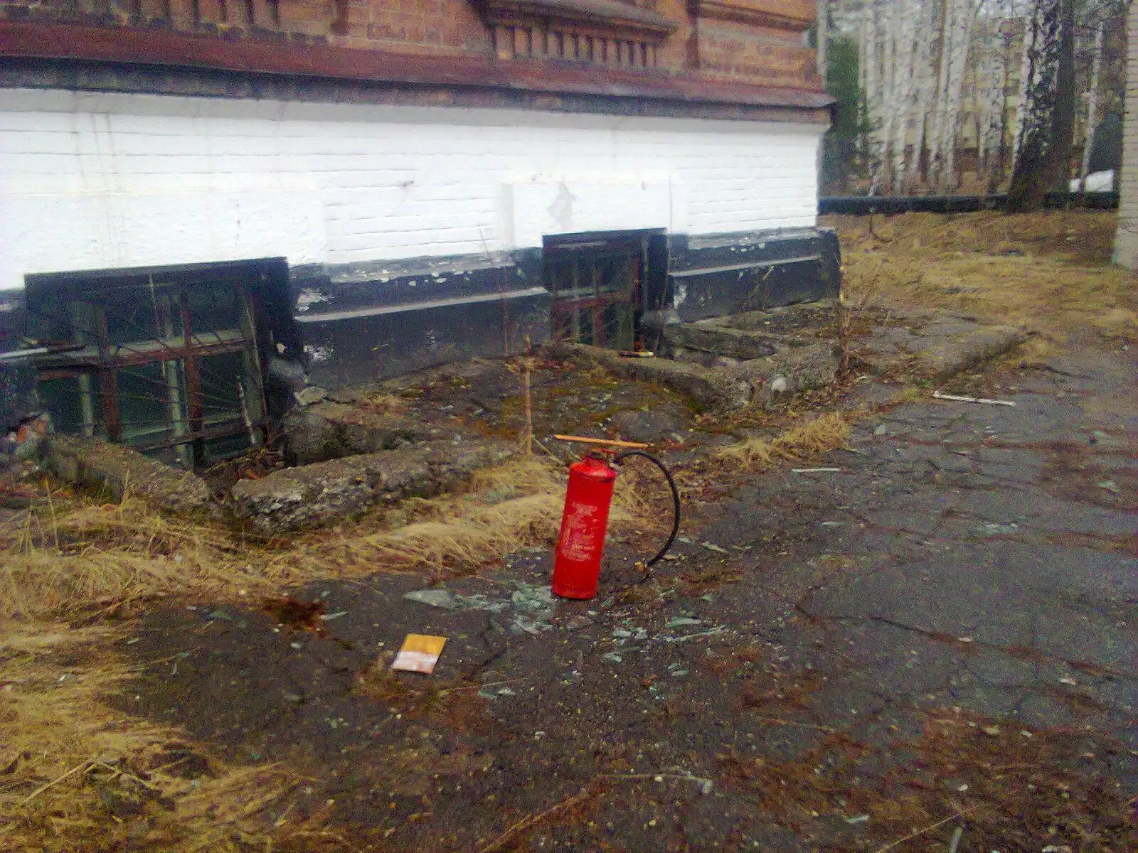 А вот такими огнетушителями вышибали окна изнутри, там их валяется довольно много.