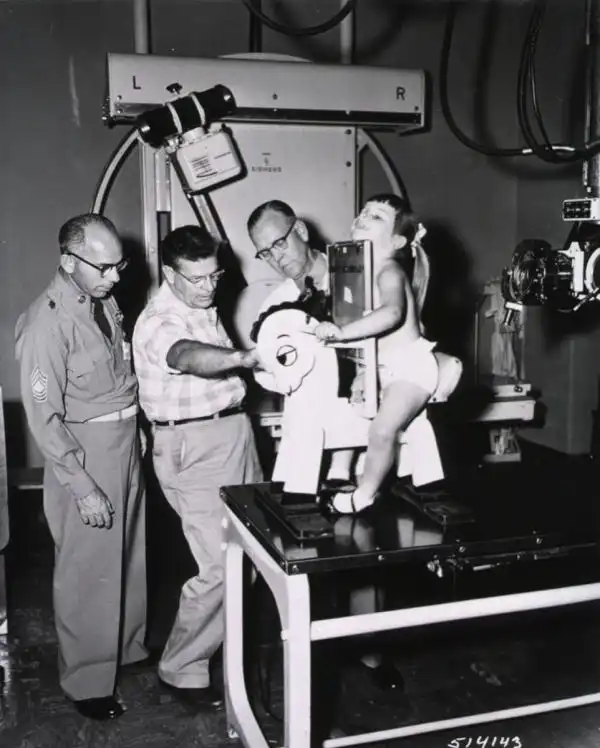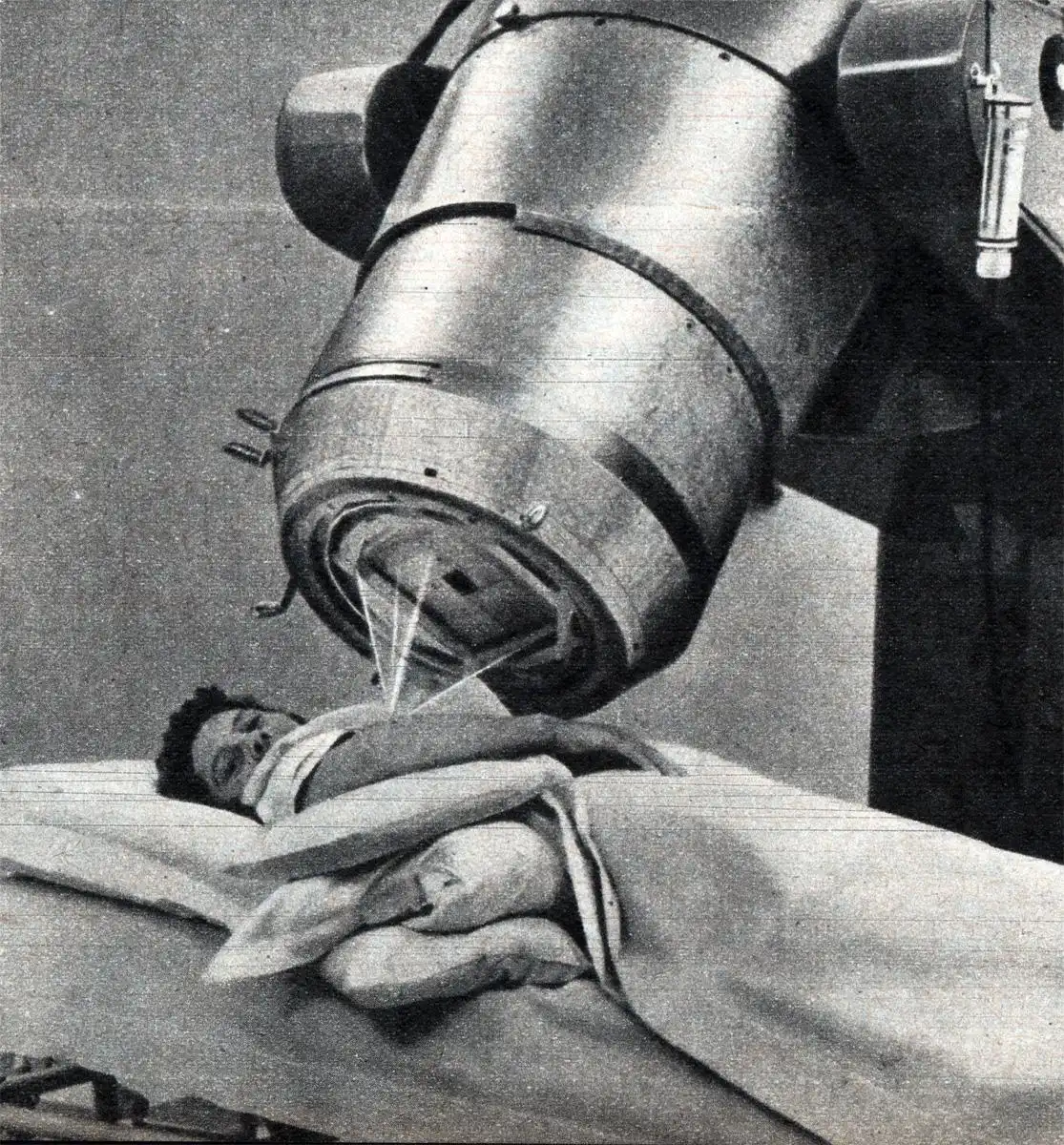 Установка для кобальтовой противораковой терапии, вращающаяся вокруг пациента (1955 год).