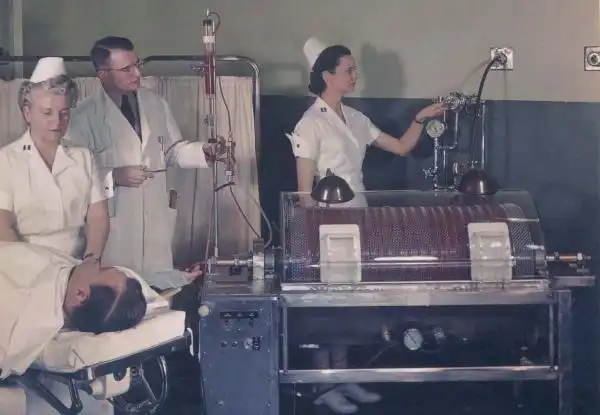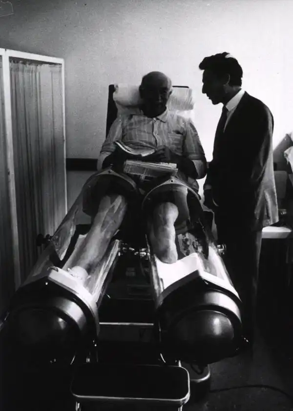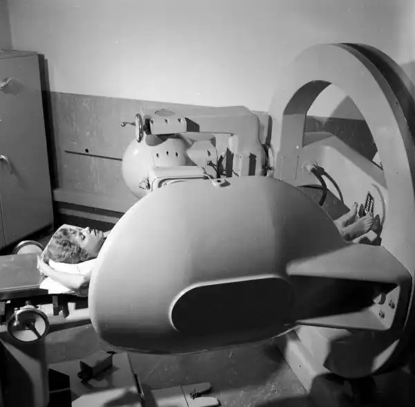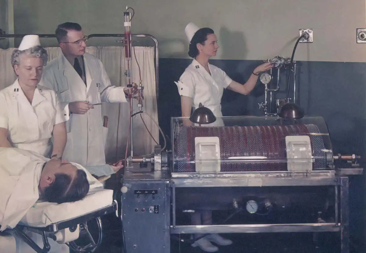 Переносной аппарат искусственного дыхания или «железные лёгкие», разработанные для амбулаторного лечения пациентов (1955 год).