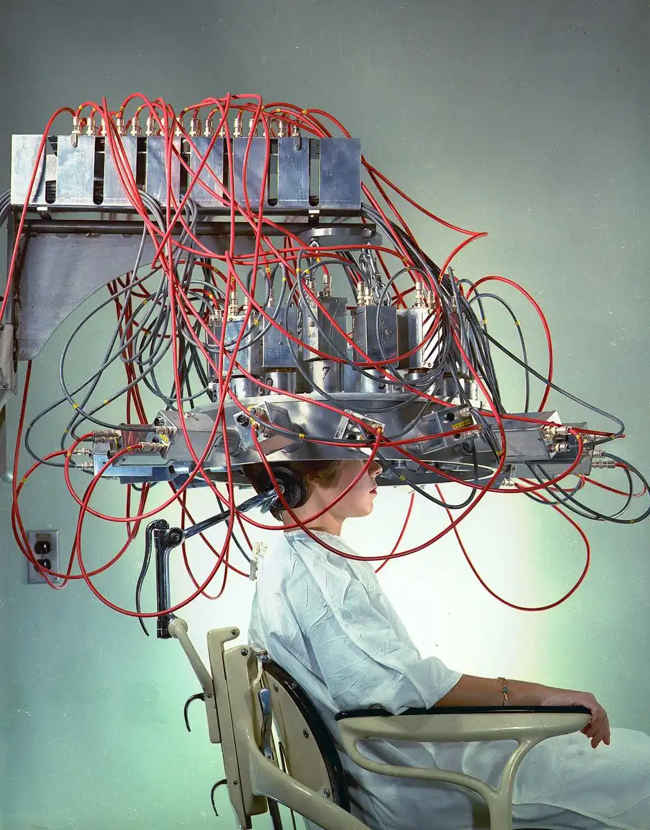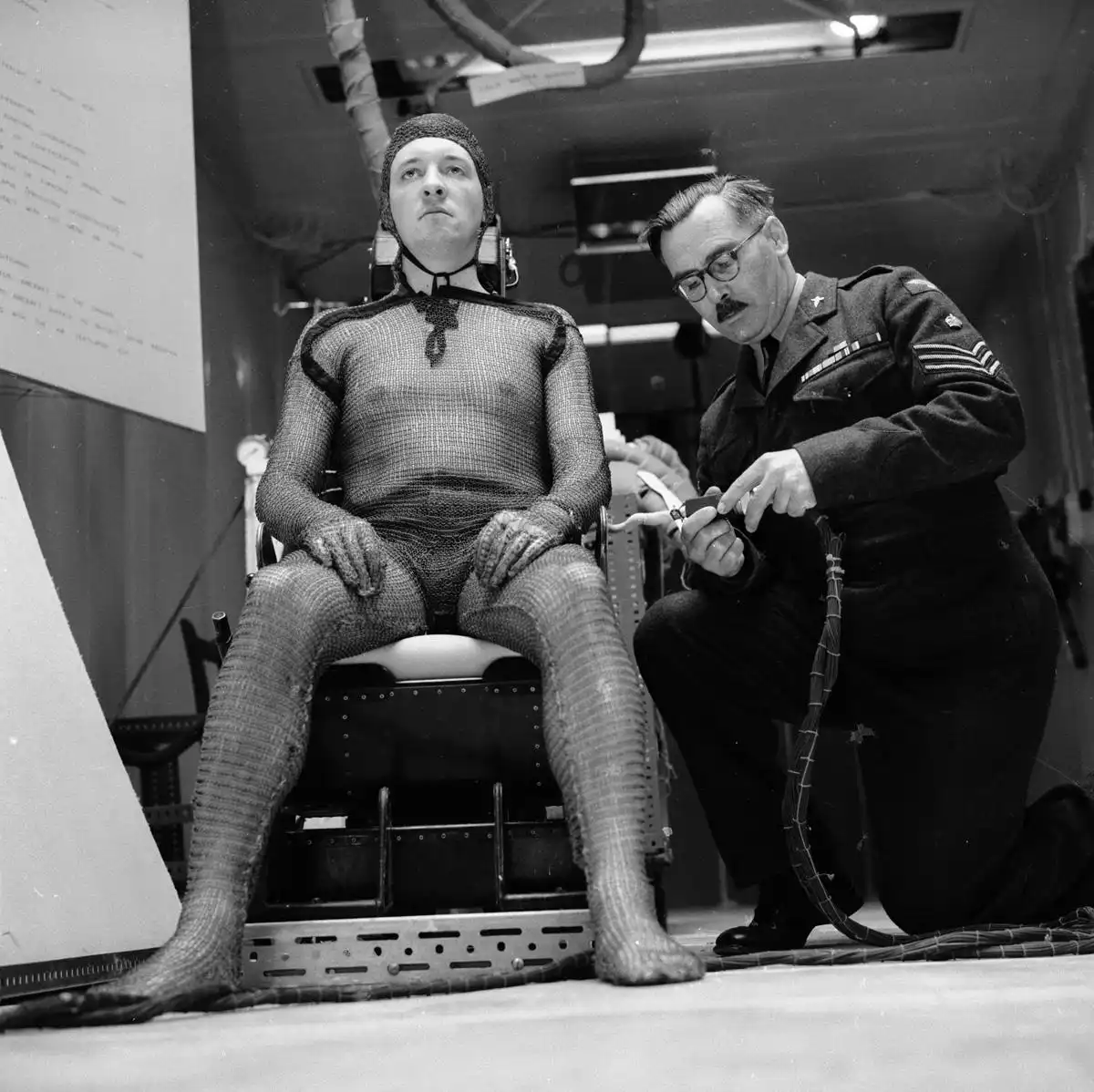 Этот костюм из проводов предназначен для измерения температуры тела при воздействии высоких скоростей во время космического полёта (1960 год).