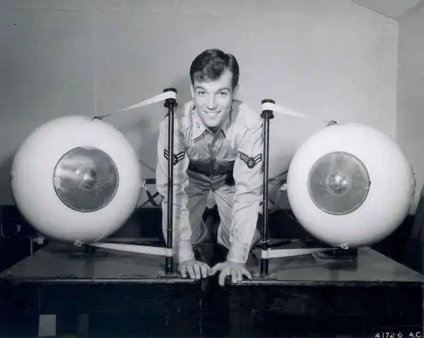 Доктор Г. Байфорд стоит под оптокинетическим барабаном, одев линзы с миниатюрными лампочками, во время проведения эксперимента по исследованию рефлекторных движений глаз и их связи со зрительными иллюзиями в Институте авиационной медицины в Фарнборо (1960 год).
