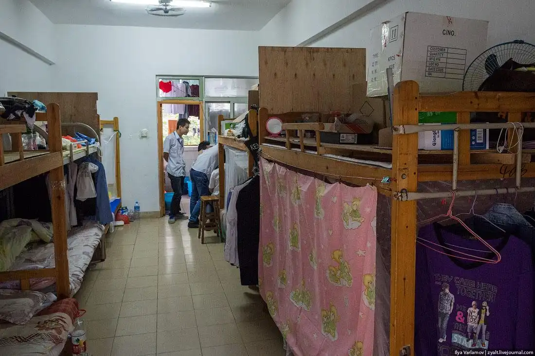 Ознакомимся с бытом рабочих. Это общага. Общежитие работникам предоставляется бесплатно.