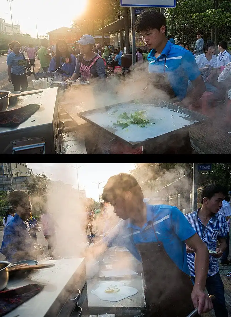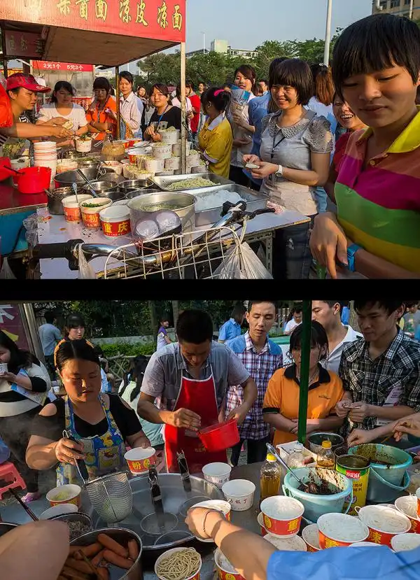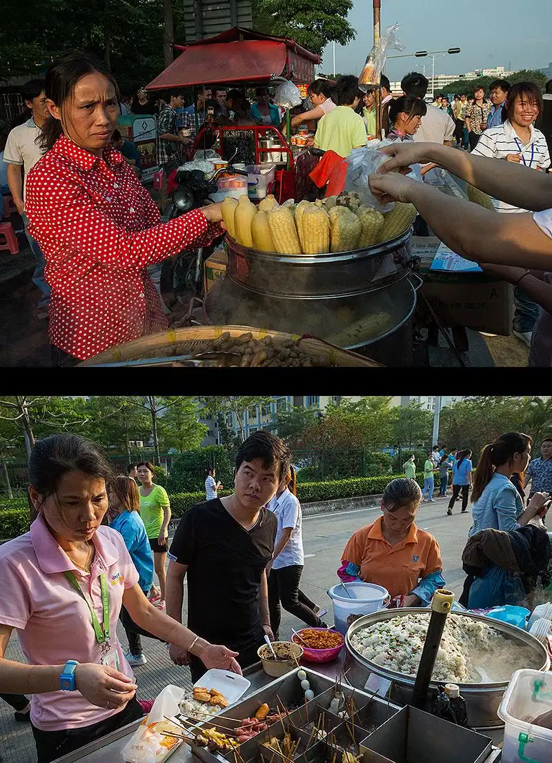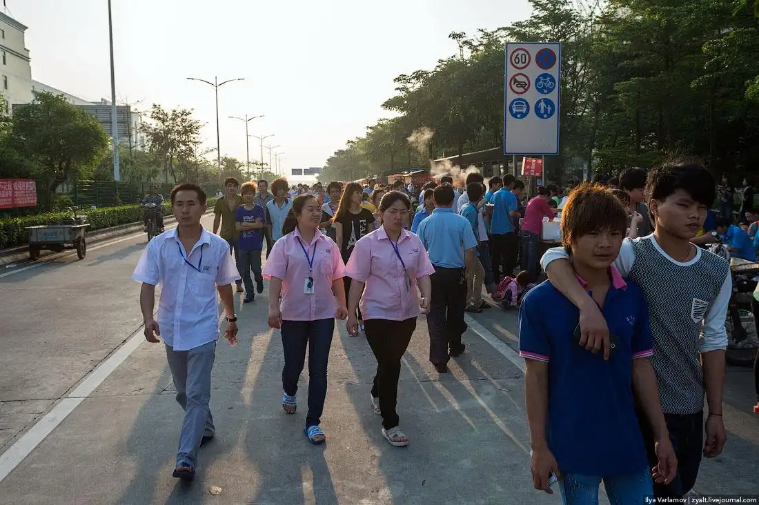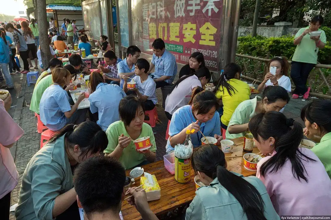Я приехал ближе к концу дня. Рабочие вывалили на улицу, чтобы перекусить. Средняя зарплата на китайской фабрике - 3 доллара в час. Но никто не пойдет работать 8 часов. Главное в жизни китайского рабочего - переработки! Ведь за сверхурочные платят полторы ставки, а за работу в выходные - двойную ставку! Именно поэтому все рабочие в 17-30 выходят с фабрики, чтобы перекусить и в 18-00 заступить на вечернюю смену. Никто домой не уходит.