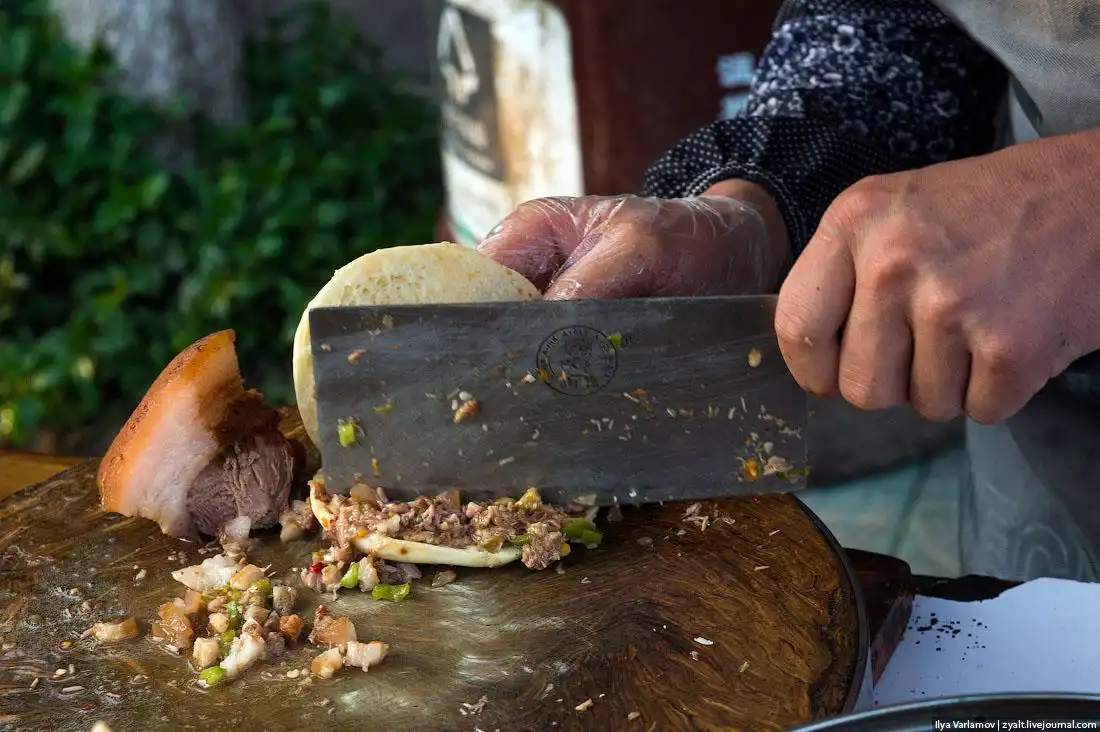 Китайский гамбургер: рубят какие-то отходы мясные и закидывают это в булочку.