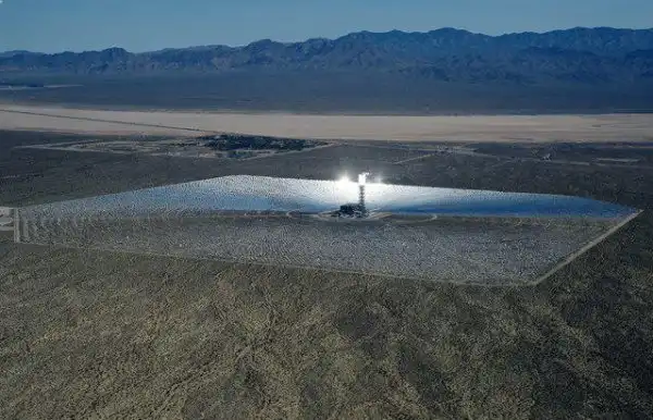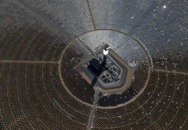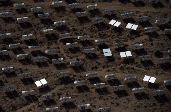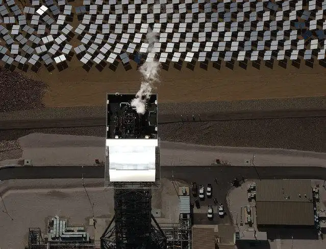 На снимке, сделанном с высоты птичьего полета 20 февраля 2014 года в пустыне Мохаве в Калифорнии, недалеко от Примм, штат Невада видна солнечная электрическая генерирующая система Айванпа. Крупнейшая солнечная термическая система питания в мире, принадлежит компаниям NRG Energy, Google и BrightSource Energy. Станция открыта на прошлой неделе в Айванпа Драй Лейк и состоит из 347 000 зеркал с компьютерным управлением, которые фокусируют солнечный свет на котлы, находящиеся на вершине трех 459-метровых башен. Там вода нагревается для производства пара для турбин, обеспечивающих электроэнергией более 140 тысяч калифорнийских домов.