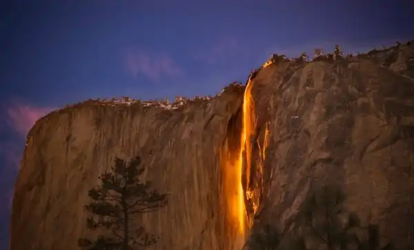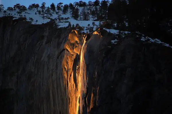 Феномен возникает, когда багровые солнечные лучи во время заката попадают на стекающую по гранитному склону воду. Создается впечатление, что со скалы падает огненный водопад.