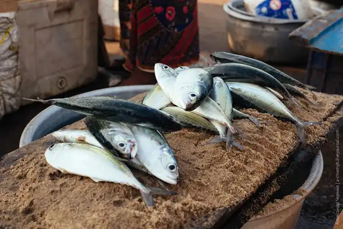 Оставшуюся рыбу продают рядом, прилавки из подручных средств, лед и мокрый песок.