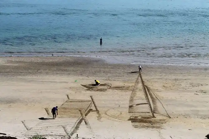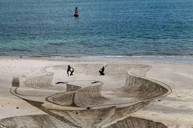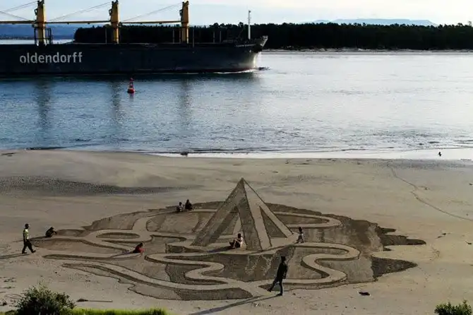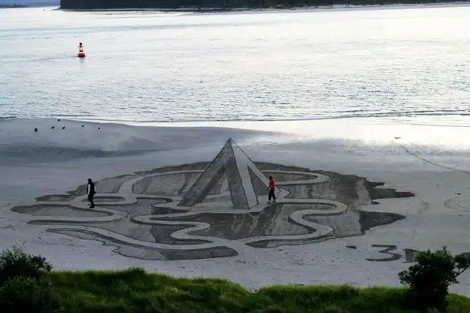 Художники-новаторы рисуют свои удивительные картины на берегу океана в Новой Зеландии. На пляже города Маунт Маунгануи. Возглавляет группу ее идейный вдохновитель – Джейми Харкинс. А помогают ему Люсия Лупф, Дэвид Рэнду и Констанца Найтингейл.