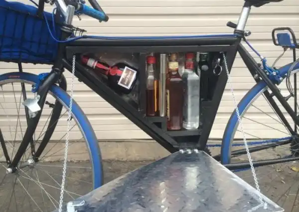 Все интереснее и веселее! В контейнере обустроен мини-бар, причем с аккуратными и продуманными местами для бутылок. Хитрый ход, надо признать. На таком велосипеде можно делать бизнес на велодорожке, предлагая услуги проезжающим велосипедистам.