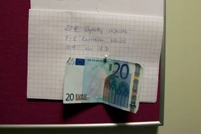 Подъезд дома в Хельсинки. Надпись гласит: 20 евро. Найдены в подъезде между 1 и 2 этажом 11 сентября в 18.30.