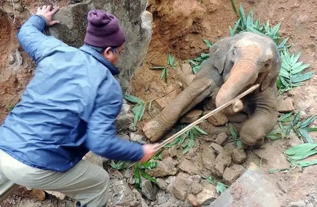 Пассажиры поезда увидели, что слоненок провалился в яму и уговорили машиниста остановиться и помочь ему. Пока ждали помощь, люди подкармливали его листьями, а приехавшие спасатели вытащили животное.