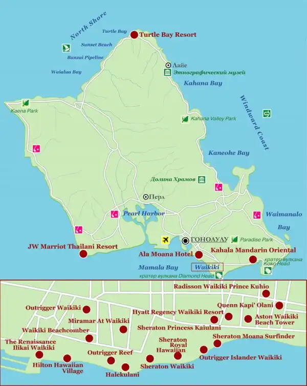 Почти вся туристическая инфраструктура и все отели острова размещены в Вайкики, курорте, напоминающем нечто среднее между Майами-Бич и Токио. Здесь гостям никогда не придется скучать, ведь Вайкики, изобилующий шикарными ресторанами, соблазнительными кафе, разнообразными магазинами и озаряющими окрестности ночными клубами, никогда не спит и всегда готов предложить развлечения на любой вкус. Однако для того, чтобы ощутить настоящий дух Гавайев, вам обязательно нужно выбраться за его пределы: побродить по шумным базарам пестрого китайского квартала Гонолулу, отправиться в поход по одной из горных тропинок Tantalus и провести время в Haleiwa, настоящем рае серферов.