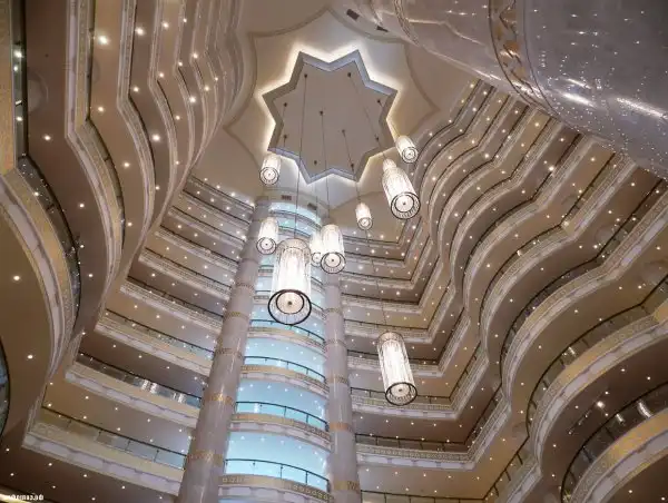 Внутри роскошной гостиницы «Огузкент». Убранство отделанное белым мрамором и стеклом, здание отражает идею возрождения страны, на возведение и дизайн которого было затрачено 270 миллионов евро, оформлено в традиционном туркменском стиле.