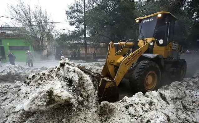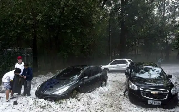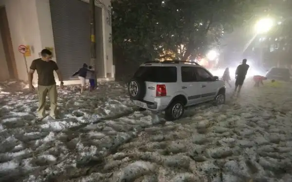Просто невероятно много. В некоторых районах города земля покрыта слоем градин толщиной до 20 сантиметров. Вскоре на местной жаре градины начали подтаивать и превращаться в однородную ледяную корку. Местные дети, ошалев от такого сюрприза ( снег в тех краях редкость ) играют, взрослые пытаются как-то расчистить улицы.