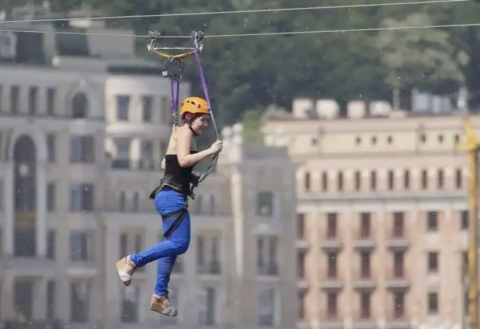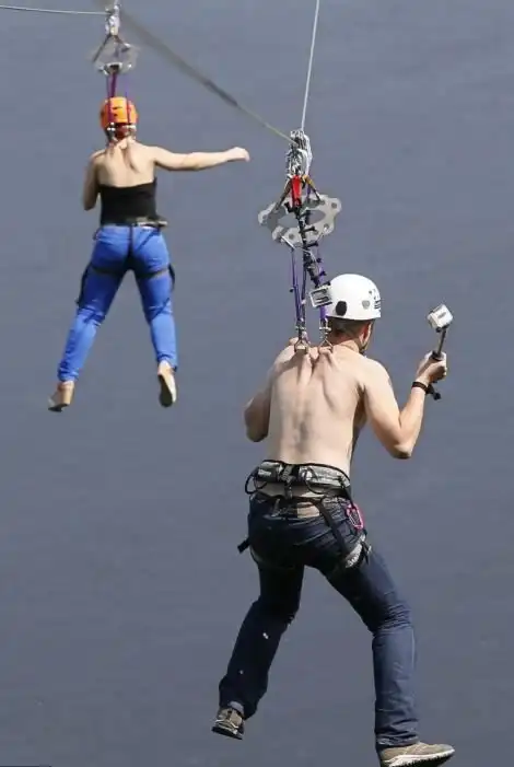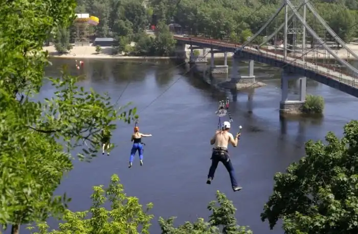 Честно говоря, я никогда не понимал, для чего некоторые люди намеренно калечат свое тело и подвергают себя таким испытаниям.. Далее вы увидите, как парочка киевских экстремалов переправилась через реку Днепр по "канатной дороге". Длина канатной дороги составляет 352 метра, а максимальная скорость такого "полета" может превышать 60 км/ч.