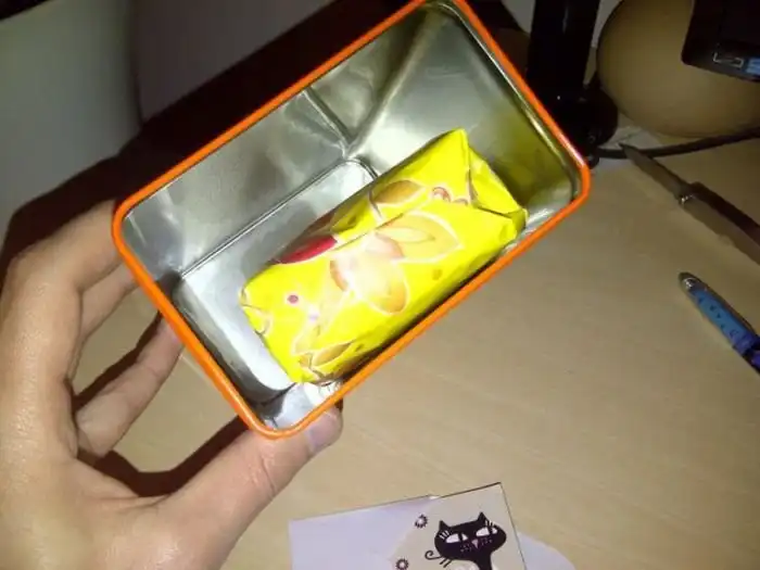 Он засунул упакованную коробку в алюминиевую банку