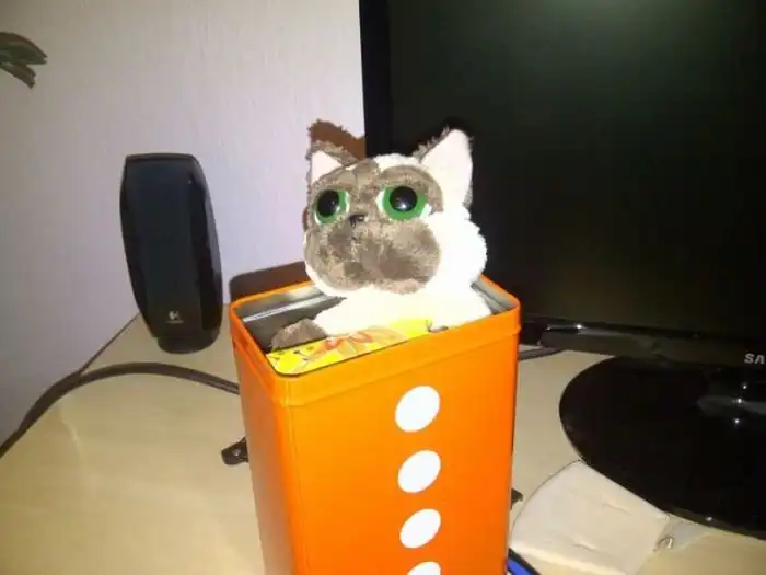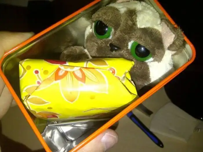 Затем, чтобы коробка внутри не болталась, выдавая что внутри находится более маленькая коробка, парень решил зафиксировать её плюшевым котом