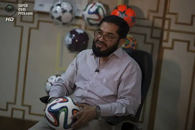 Генеральный директор Forward Sports (Pvt) Ltd. Хаваджа Ахтар Масуд даёт интервью корреспонденту с официальным мячом ЧМ-2014 собственного производства.