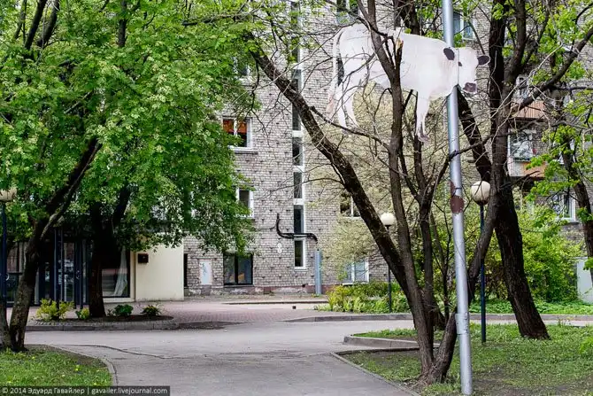Поделюсь третьей мыслью и перейдем к прогулке по городу. Итак, третья мысль — «Что корова делает на дереве в одном из дворов?»
