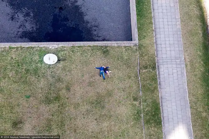 К башне подошла парочка, легли на травку…