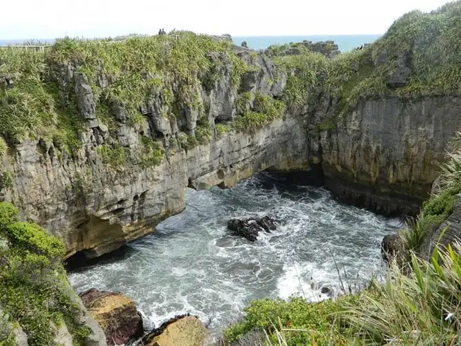 Блинные Скалы в Новой Зеландии – в большой степени разрушенная известняковая область, где море прорывается через несколько вертикальных отдушин во время приливов. Это место можно обходить разными проходами, вьющимися среди внушительных горных формирований.