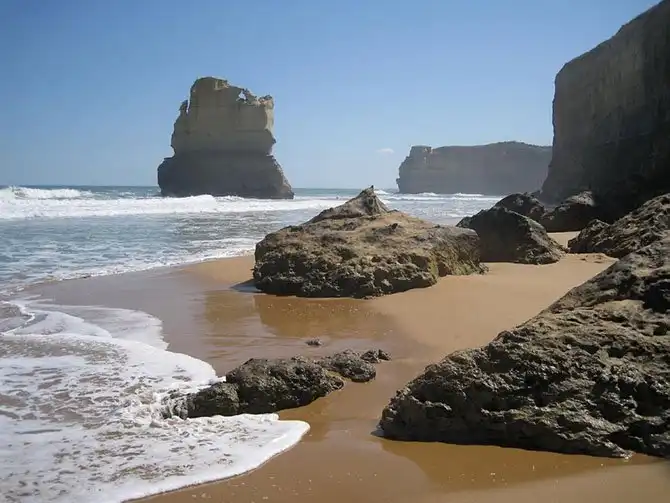 Эти двенадцать апостолов – группа башен известняка у берегов Национального парка Порт-Кэмпбелл в Виктории, Австралия. Апостолы были сформированы эрозией: резкие погодные условия от южного Океана постепенно разрушали мягкий известняк, сформировав гигантские утесы, которые затем стали арками. Арки, в свою очередь, разрушились, оставив башни 45 метров высотой.