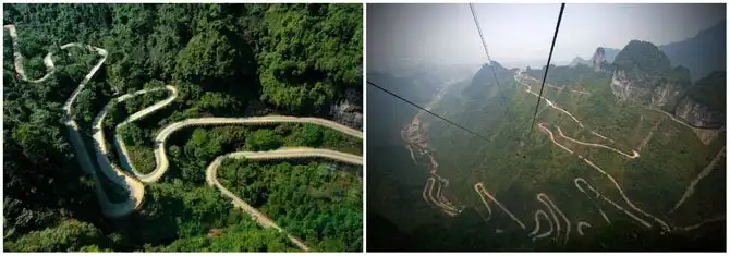 Это шоссе носит название Big Gate Road, но в народе его называют просто — Дорога в небеса. И дело даже не в высоте, на которую поднимается полотно дороги, а в сложности и количестве завитых поворотов. К слову о высоте — дорога берет своё начало в 200 метрах над уровнем моря и поднимается на 1300 метров. Её также называют дорогой 99 поворотов, так как девятка является счастливым числом в Китае, символизируя небеса и 9 дворцов.