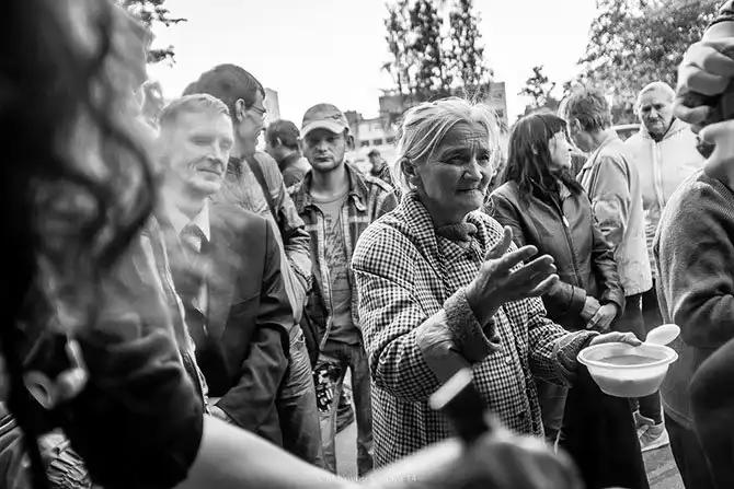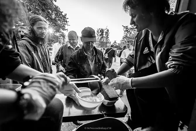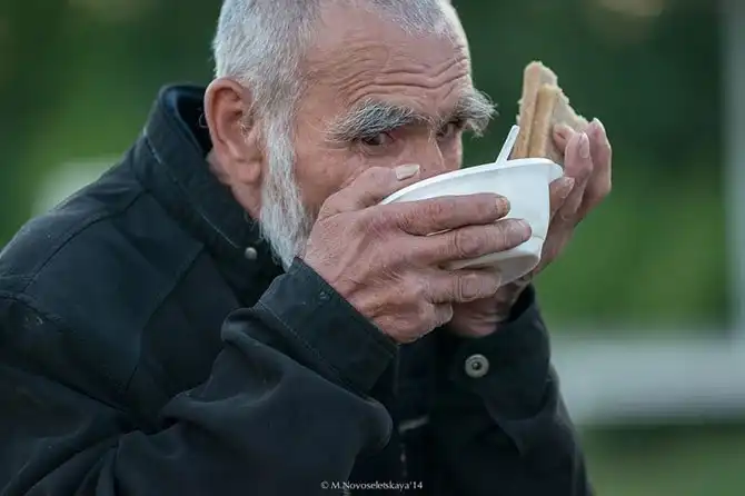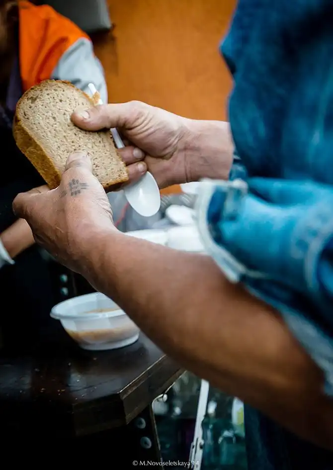 Сразу бросается в глаза более возрастной контингент. Тут больше людей, которые приходят за хлебом и чаем, у которых есть жилье, но находятся на краю бедности.