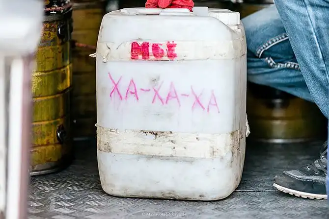 Сюда привозят еще и воду, причем в «именных» канистрах. Отрадно, что с чувством юмора в непростых жизненных ситуациях всё в порядке.