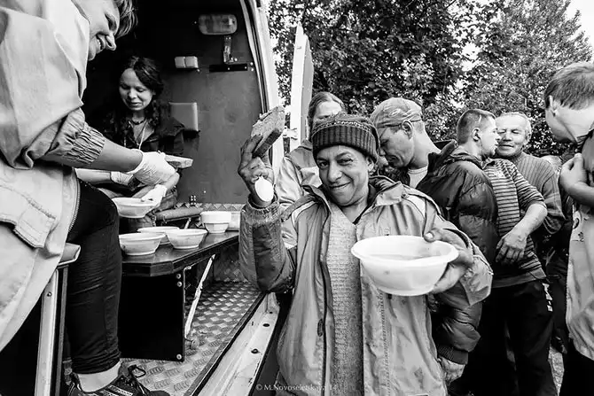 Экстренная гуманитарная помощь бездомным людям: горячая еда, социальная консультация, доврачебная помощь, человеческое участие — всё это небольшой автобус с 2-3 волонтерами и шофером. Кроме горячей пищи, доставляют медикаменты, раз в неделю выезжает врач, а также консультируют по социальным вопросам. Ежедневно помощь на стоянках автобуса получают 120-150 человек.