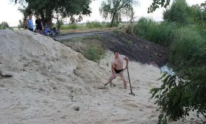 Отличный фотоотчет о том, как дачники решили своими руками оборудовать песчаный пляж на берегу реки.