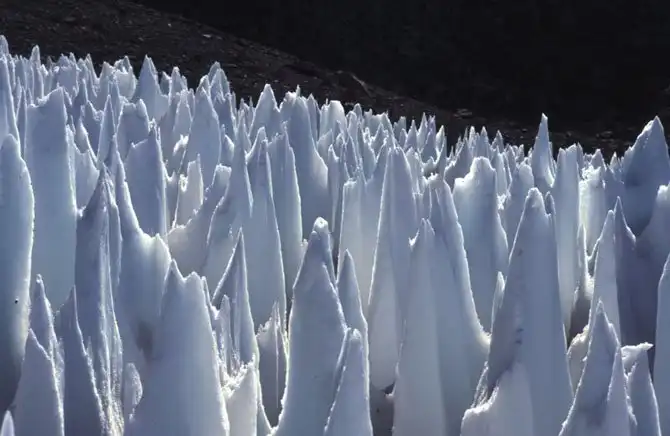 А вот ещё одно интересное ледяное образование, очень далекое от подводных областей – высоко в горах. Эти колючие ледяные поля называются пенитентес, и каждый осколок может достигать колоссальной высоты – 4 метра. Эти пугающие структуры снега образуются в высокогорных районах с низкой влажностью, например, в ледниках Анд. Если условия правильные, то лучи солнца такие жаркие, что они действительно могут сублимировать поля снега. Это означает, что замороженная вода испаряется, никогда не становясь жидкостью. Это приводит к небольшим карманам во льду, которые благодаря своей форме привлекает ещё больше тепла. Острые шипы – это те области снежного поля, где солнце не было ориентировано на полное и абсолютное уничтожение.
