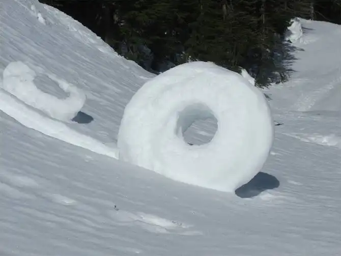 Вы помните, как в детстве, когда шел снег, все старались быстро скатать большой снежный ком? Вы либо играли в снежки, либо лепили снеговиков. У природы есть собственный способ лепки из снега – снежные пончики. Эта редкая форма образуется в идеальных условиях температуры, во время снегопада или метели. Если часть снег склеивается с другой частью, то гравитация и ветер делают свою часть работы, и ком катится сам. Но в этом случае тенденция к сжатию создает форму тора, который может достигать до 66 см в высоту.