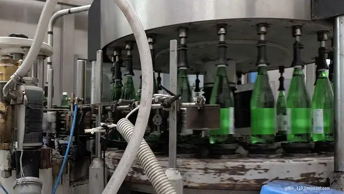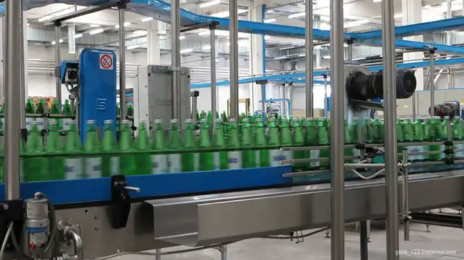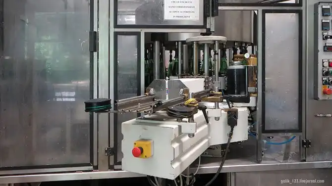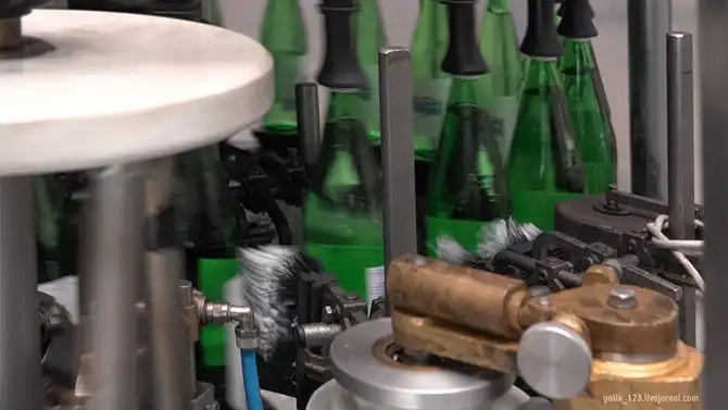 Затем бутылки попадают на разливочную линию, где их наполняют водой, потом поступают на линию укупорки специально калиброванной крышкой для обеспечения герметичности. После этого наклеивается этикетка.