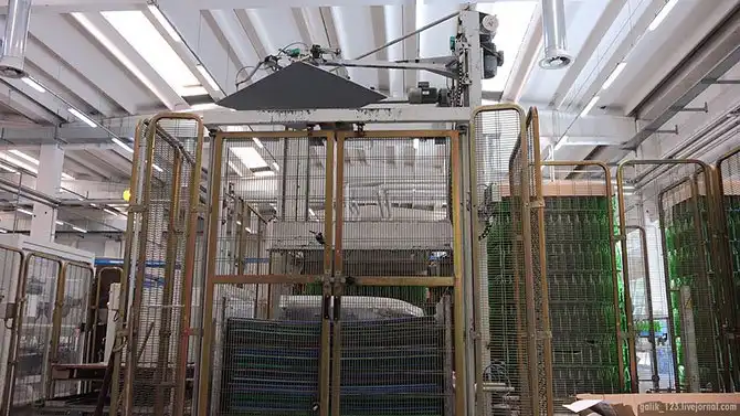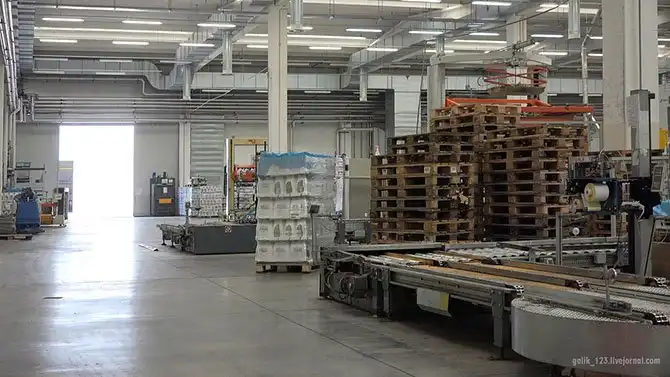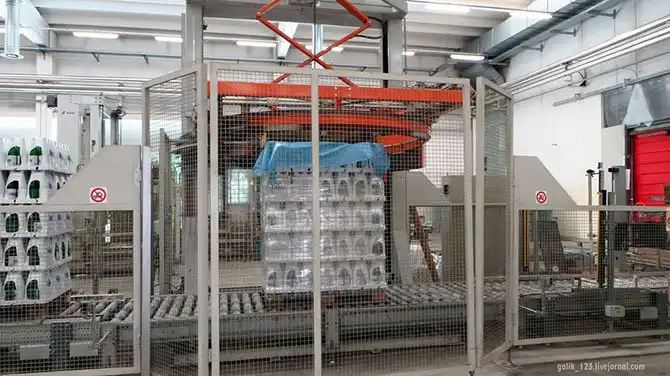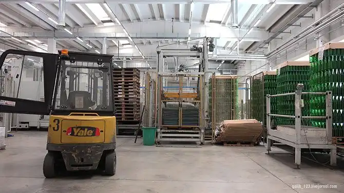 Справа – пустая тара, в центре – машина упаковки готовой продукции, слева – кар для перемещения пустых бутылок и готовой продукции. Левее за кадром – готовая продукция на поддоне.