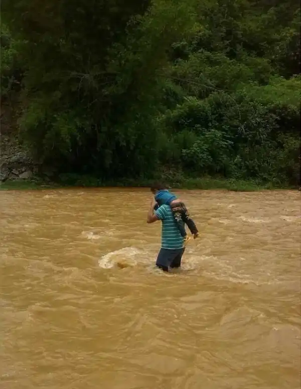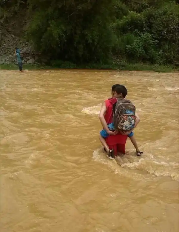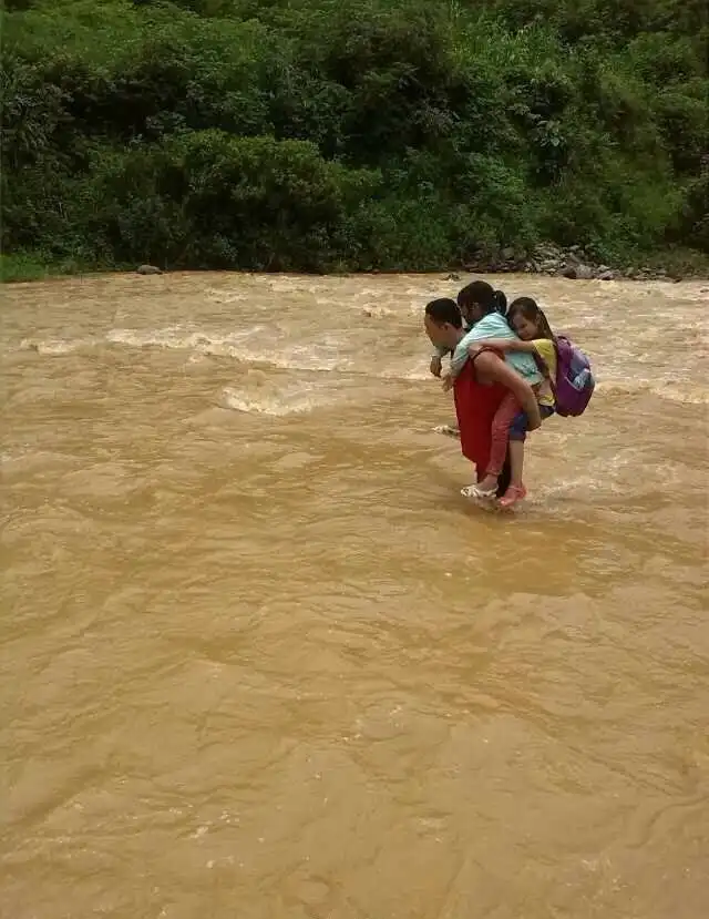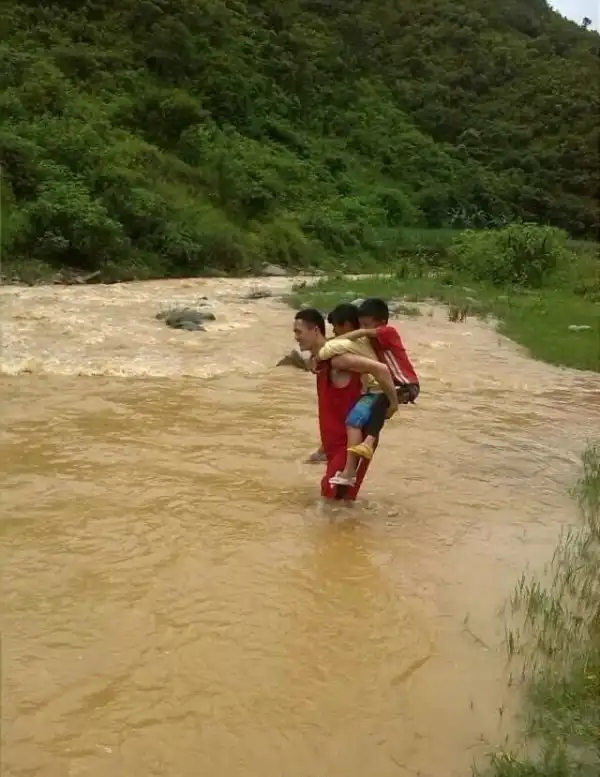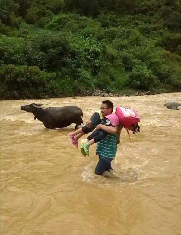 Учителя начальной школы округа Фунин, провинция Юньнань, вынуждены исполнять роль переносчиков, чтобы их ученики могли попасть на уроки. Все дело в проливных дождях, из-за которых привычная дорожка в школу превратилась в настоящую реку. Так что у детишек теперь каждый день импровизированный урок природоведения.