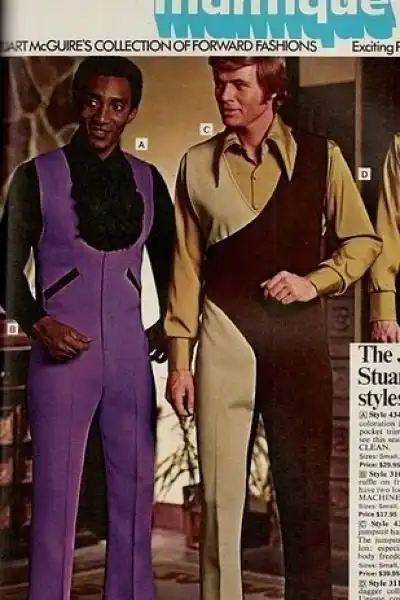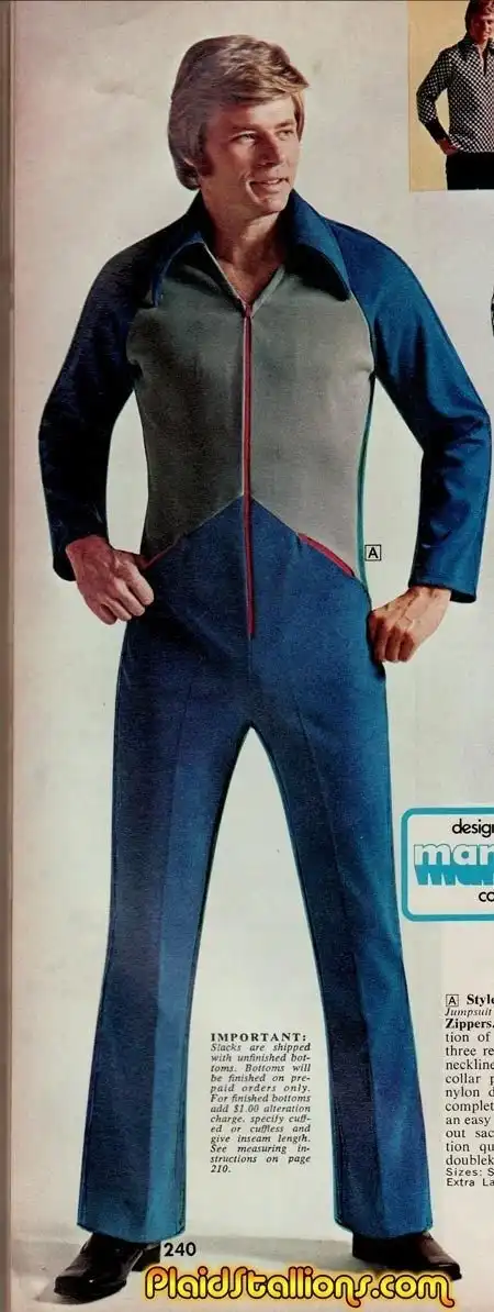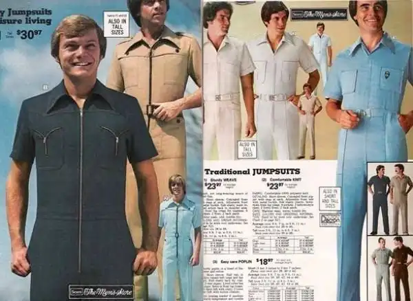 Немного ада из 70-х годов прошлого века. Тогда в моде были комбинезоны, причем не только женские, но и мужские. По заявлениям рекламщиков, в комбезе из полиэстера мужчина выглядит сексуально. Особенно, если у него есть усы и затемненные очки с толстенными линзами
