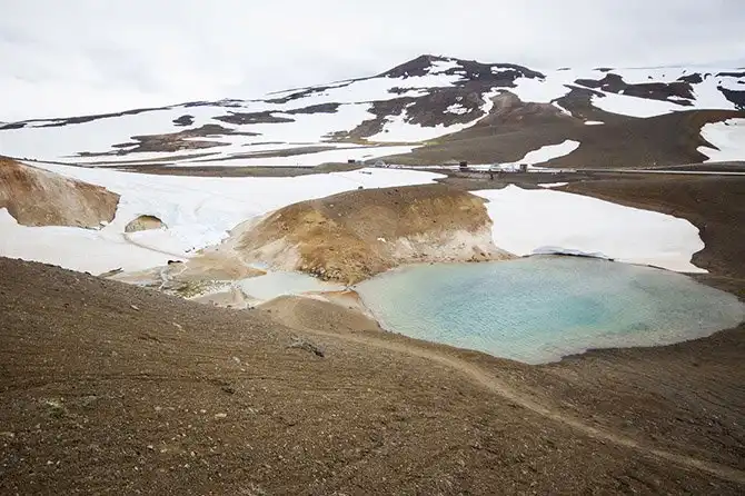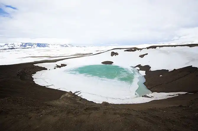 Кратер Крафла: замерзшая лава, покрытая снегом, гипнотизирует своим сияющим бирюзовым цветом. Однако сбивающий с ног ветер не даст вам долго любоваться этой красотой.