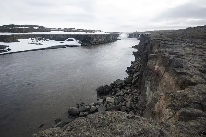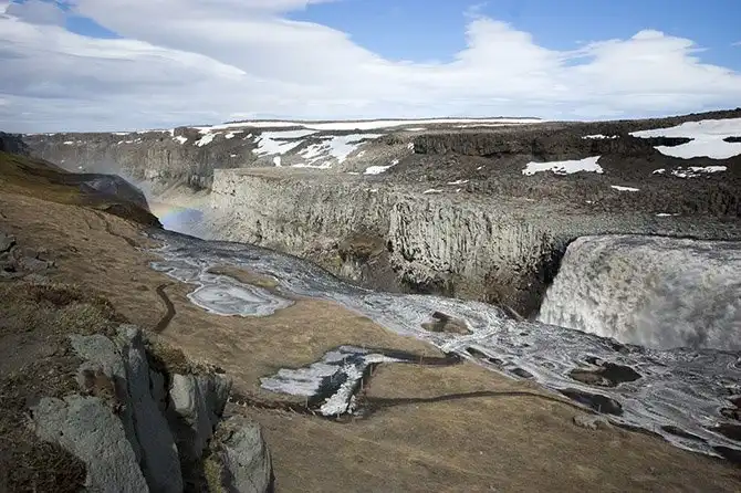 Самое впечатляющее зрелище представляет собой водопад Деттифосс. Ощущение того, что вы вот-вот попадете в совершенно другой мир, возникает уже на пути к нему: вы едете несколько километров по дороге, вокруг которой нет ничего, кроме гравия, валунов и тумана. От парковки надо пройти километр по отмеченной флажками дорожке, прежде чем вы окажетесь у водопада, высота которого всего на 9 метров меньше высоты Ниагарского.