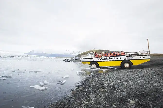 Можно взять экскурсию на такой кораблик с колесами, который отвезет вас по суше до ледника, а потом по воде в его центральную часть.