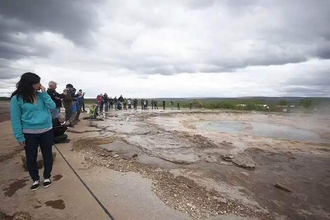 Самый крупный гейзер в Исландии так и называется, «Гейсир». Он может выбрасывать воду на высоту до 60 м, благодаря чему и стал самым известным в Европе. Однако большую часть времени он находится в спячке, а туристы толпятся у его младшего собрата, гейзера Строккур, который выбрасывает воду всего на 20 м, но зато каждые 5 минут.