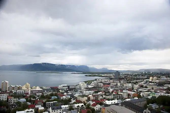 Вид на Рейкьявик со смотровой в церкви Хатльгримскиркья.