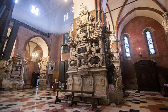 Вдоль стен расположены усыпальницы знатных горожан XIV-XVI вв., две из которых украшены фресками Альтикьеро и Джусто де Менабуои.