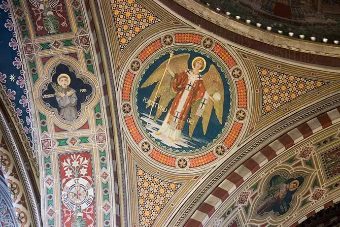 Огромное пространство сводов центрального нефа и капелл за алтарем украшены фресками XX в.