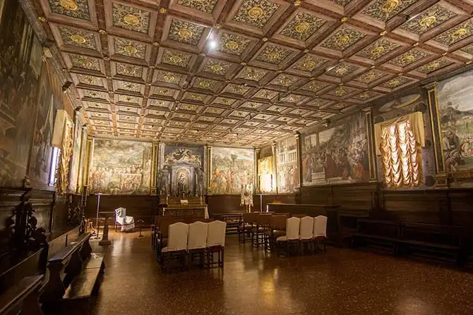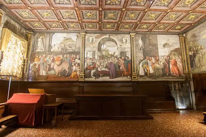 Другие фрески зала – работы Франческо Вечеллио (старший брат Тициана), Бартоломео Монтаньи, Доменико Кампаньолы и др.