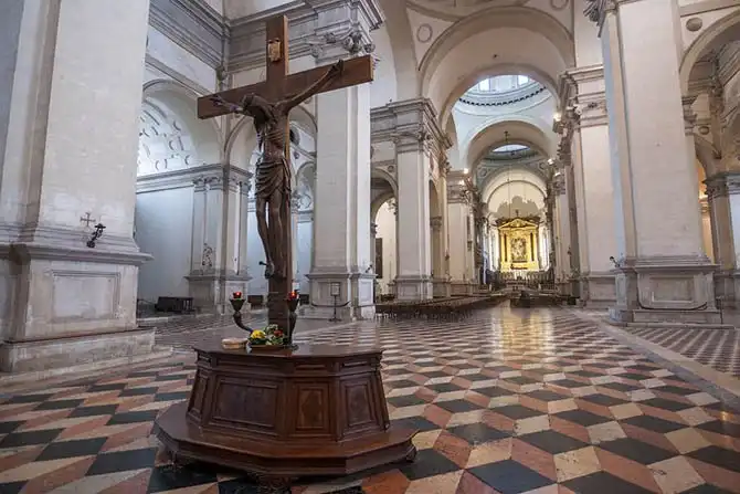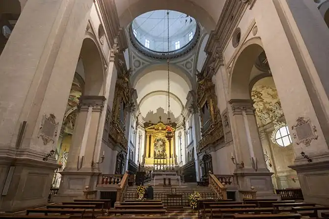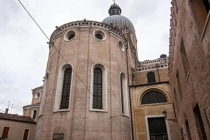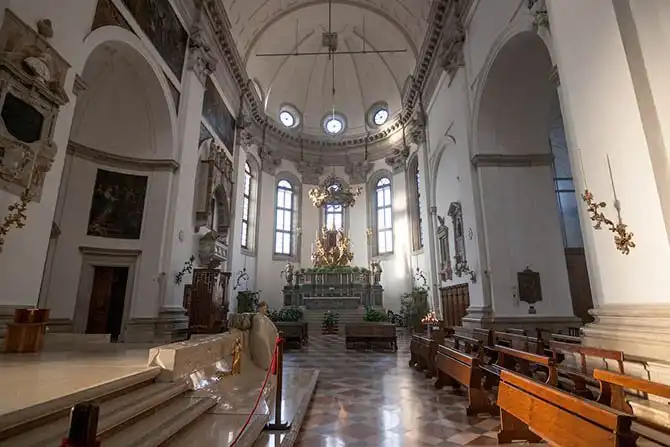 Интерьер, из-за размеров пространства, кажется немного пустым. На самом деле, тут есть на что посмотреть: алтарный образ – “Мученичество Св. Иустины” Паоло Веронезе (считается одной из лучших работ мастера).